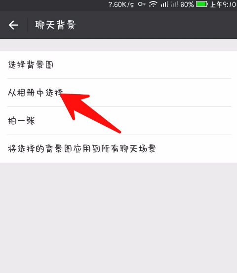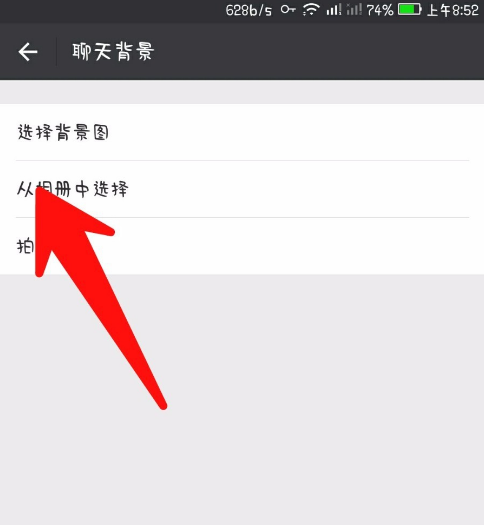 7、在聊天栏目中,点击“聊天背景”,这里有几种选择,可以现场拍照,可以从相册选择照片,我们从相册中挑选。