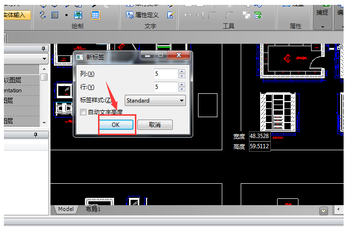 2、打开CAD文件之后,需要点击软件界面的“编辑器”选项,然后选择里面的“标签”按钮,并在图中画出表格位置,就会弹出新标签对话框。