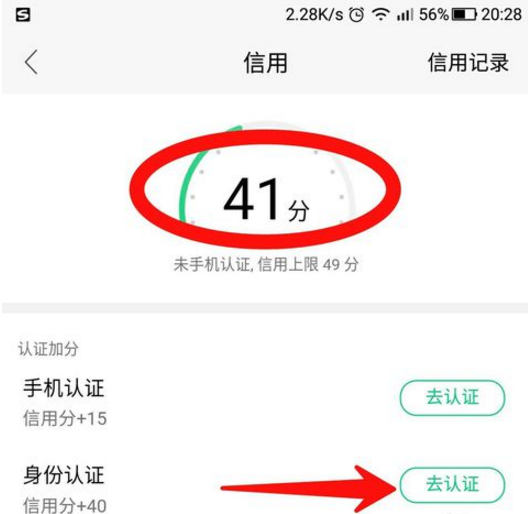 4、然后在信用分界面,可查看自己目前的信用分,验证手机可以增加15,验证身份可以增加40,点击图示位置“去认证”。