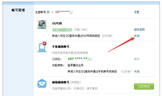 7、如果你不希望别人通过QQ号码找到你,你可以点击如图所示的“关闭”按钮,这样别人就没法搜索到你了。
