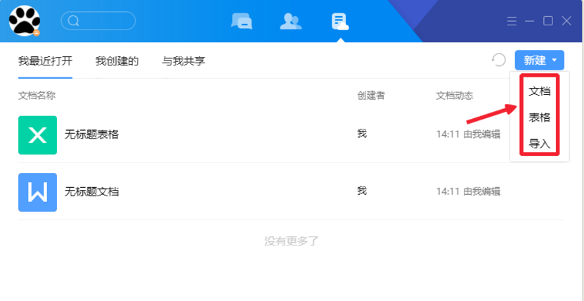 2、点击新建选项,会弹出一个小窗口,在小窗口中有很多可以操作的选项,文档和表格的意义是我们可以直接创建新的文档或者表格,而导入的意义是导入本地的文档或者表格。