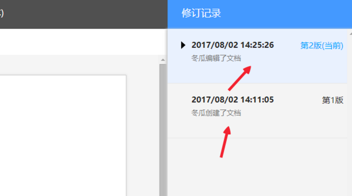 6、即使是用一个成员,在不同的时间段编辑,也是可以都保存下来的,我们把鼠标放在某一次修改记录上,就可以看到那时文档的状态,当然也能以那个时间作为文档编辑的起点。