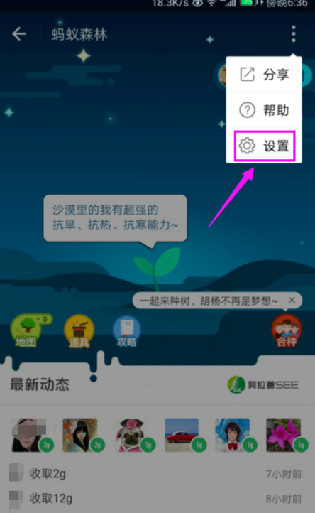 3、进入蚂蚁森林页面,我们选择按右上角的三个白点,如图。