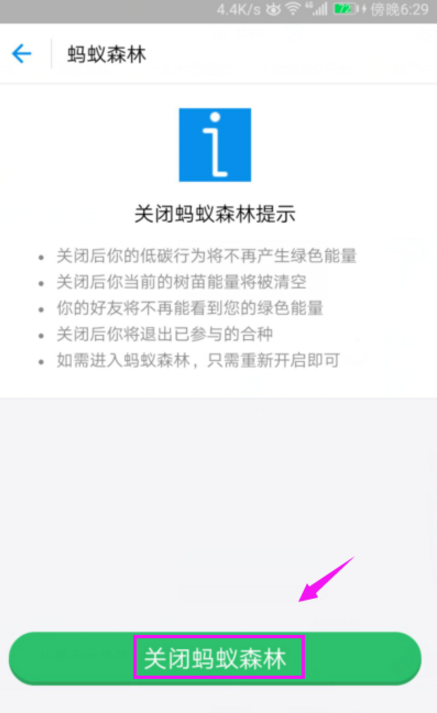 6、然后我们来到关闭蚂蚁森林提示界面,再次选择“关闭蚂蚁森林”,如图。