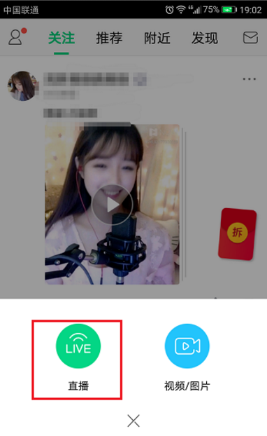 2、点击绿色的图标之后,弹出框点击直播,如下图所示: