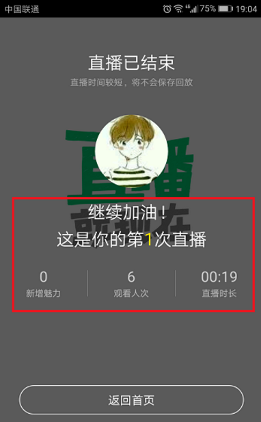 5、直播结束之后,我们可以看到直播的时长、观看人数、新增魅力等,如下图所示:
