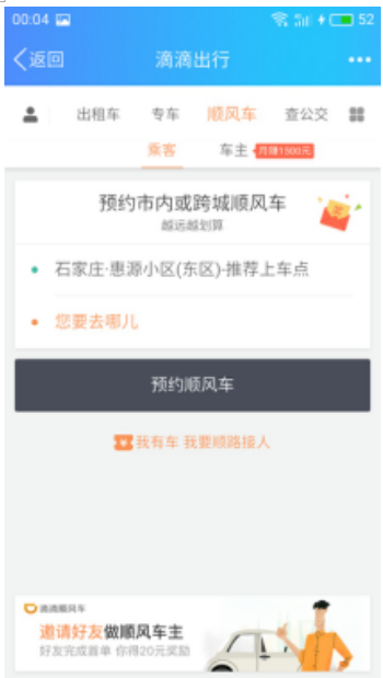 3、在里面其实就和滴滴出行APP客户端一样了,点击上方,选择出行方式为顺风车。