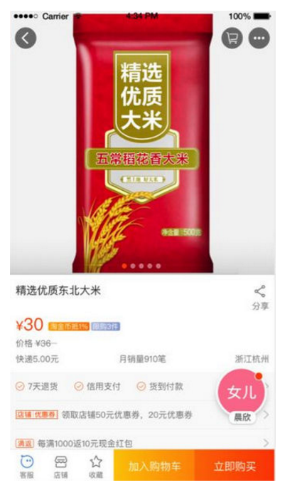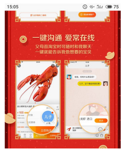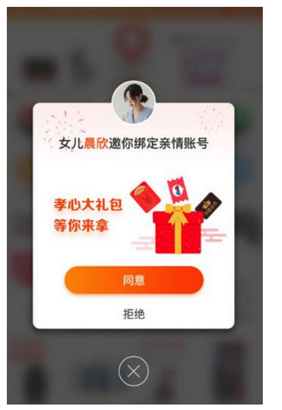 完成亲情关系绑定后,父母的手机淘宝将切换成专属页面,页面有悬浮的子女用户头像。
