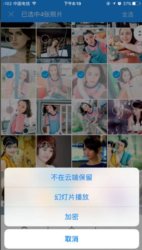 在首页点击右上角的多选,选择自己想要加密的照片。点击右下角“选项”即可出现加密,点击加密按照提示操作即可。