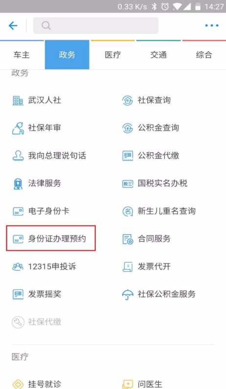 3、然后在政务中找到\"身份证办理预约\",点开,