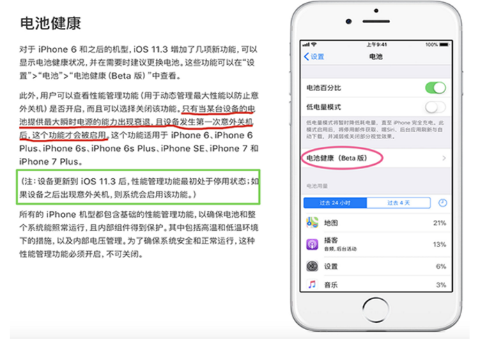 根据苹果官方的描述:对于 iPhone 6 和之后的机型,iOS 11.3 增加了几项新功能,可以显示电池健康状况,并在需要时建议更换电池。这些功能可以在“设置”>“电池”>“电池健康(Beta 版)”中查看。