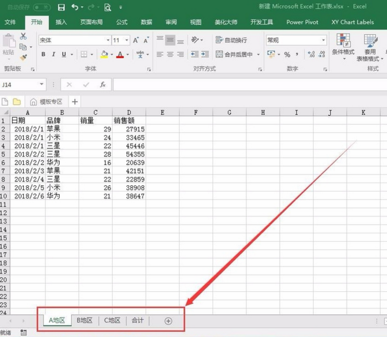 1、以下图Excel表格为例,我们需要将三个地区的手机销量情况汇总到合计表中,