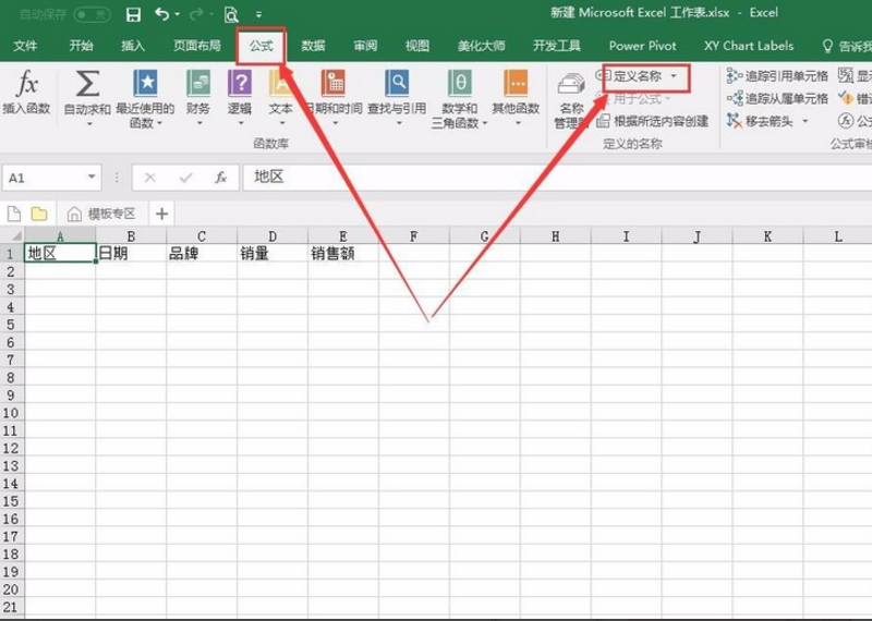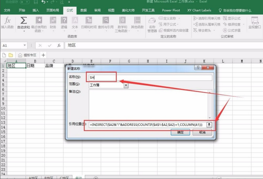 3、我们切换到名为“合计”的工作表中,在菜单栏中国依次点击公式、- 名称管理器、新建名称,在 在新建名称中输入名称“SH”,之后在“引用位置”框中输入如下公式: