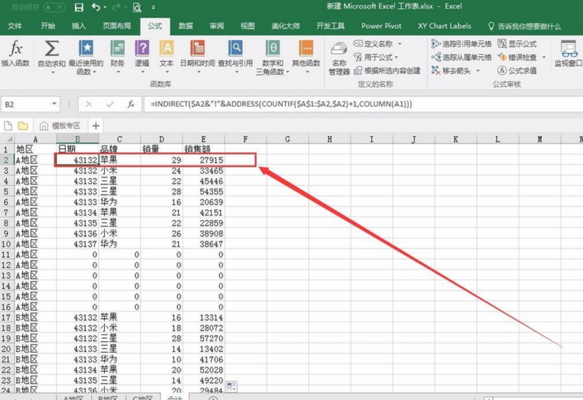 6、在B2输入如下公式并向右向下填充,取得各表的数据。
