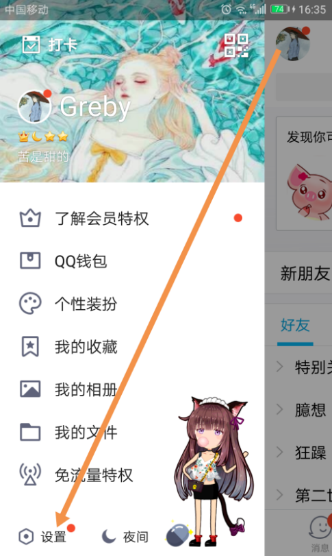 1、打开手机QQ,登录账号,点击头像,找到左下角的设置进去,
