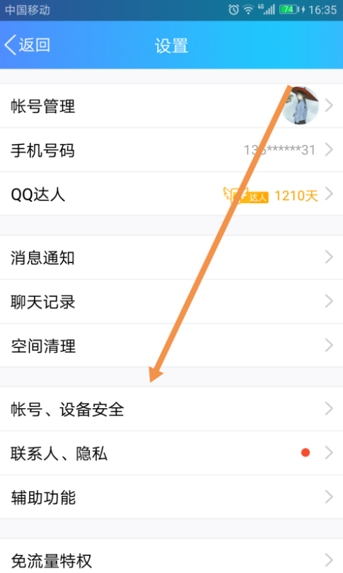 2、进入设置页面,点击选择【帐号、设备安全】进去。