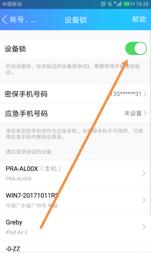 6、当然,在网吧这些地方登录了QQ,我们也可以把ip记录删除,在设备锁开启的下面,如下图。