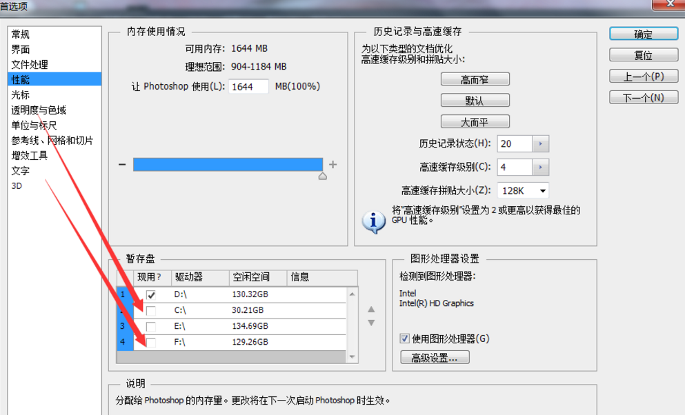 2、弹出一个框框,看到下面的暂存盘,选择一个你需要的比较大的盘。