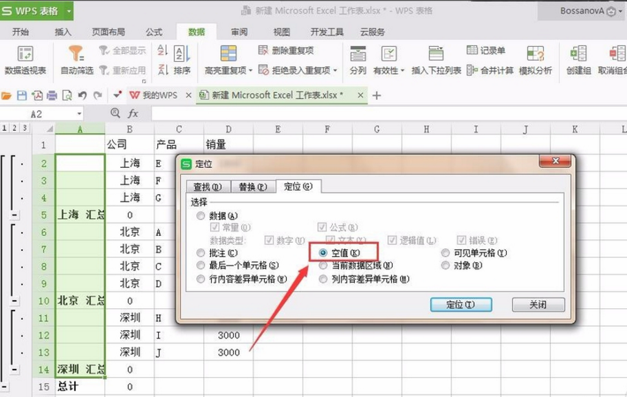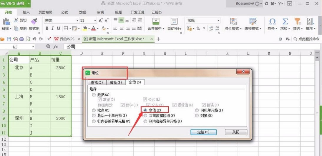 3、之后选中数据区域,使用CTRL和G组合按键打开“定位”对话框,选择“空值”并点击“确定”。