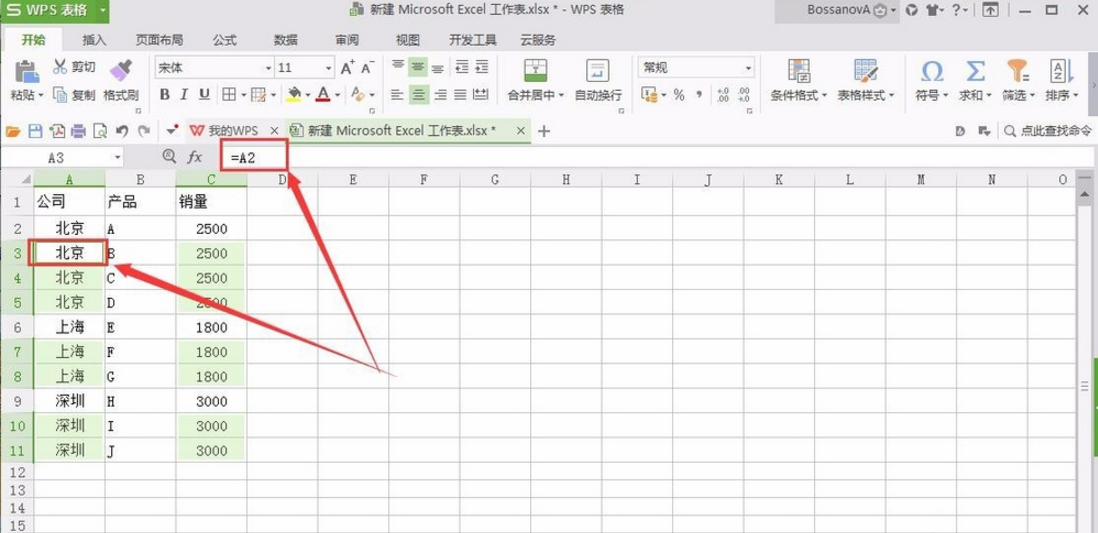 4、看到选中效果之后,在上方公式栏输入公式=A2,之后使用CTRL和ENTER组合按键进行复制填充。