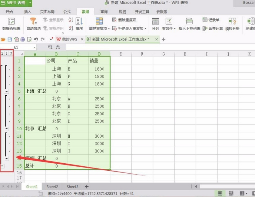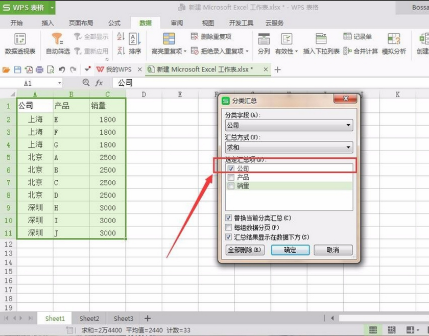 7、选中数据区域,在菜单栏中点击“数据”、“分类汇总”,在汇总项中勾选“公司”,其余采用默认选项即可。之后则可以看到分类汇总效果。