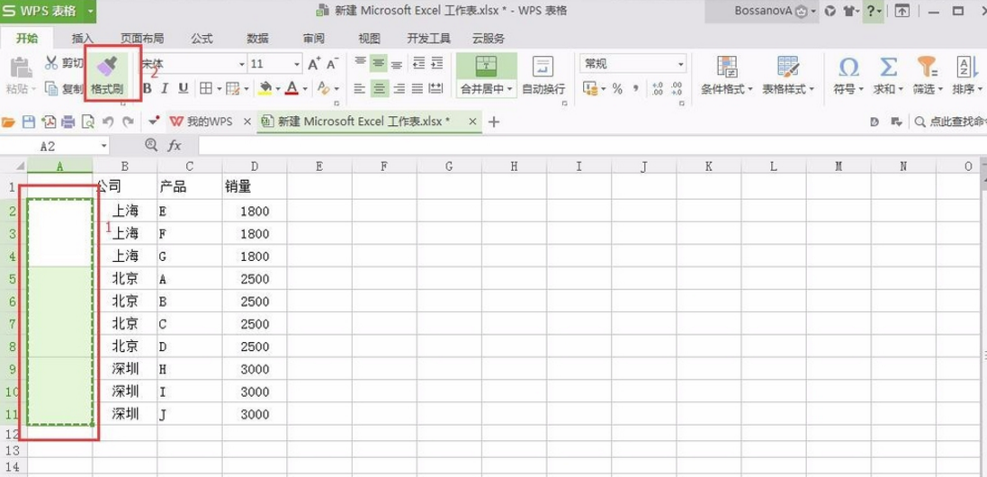 11、选中A列除第一行之外的数据区域,然后点击菜单栏的“格式刷”按钮,之后分别选中公司列和销量列、即可将A列格式复制过来,即可以看到排序效果。