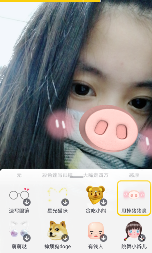 2、录视频的时候左下角有一个小表情的特效,可以点击选择自己喜欢的表情,这样人物脸上就会有表情了,非常可爱,还有一些动态特效,可以选择自己喜欢的。