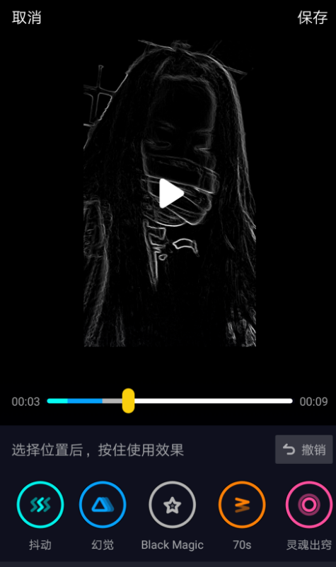 5、特效有好几种选择,是根据时间轴来分的,按住特效就可以使用了,要一直按着效果就可以了。还可以编辑时间特效,记得保存哦。