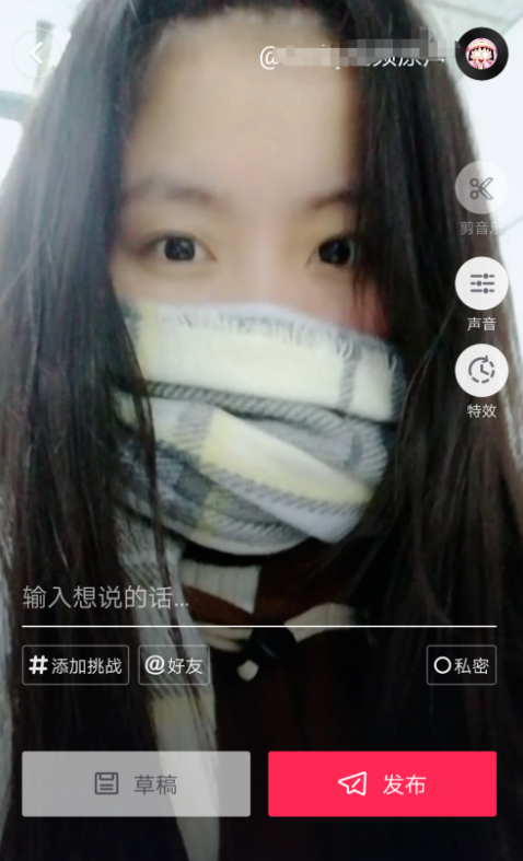 6、最后可以选择声音。可以编辑影像原声和插入声音的音量大小,记得保存,然后输入想说的话点击发布。