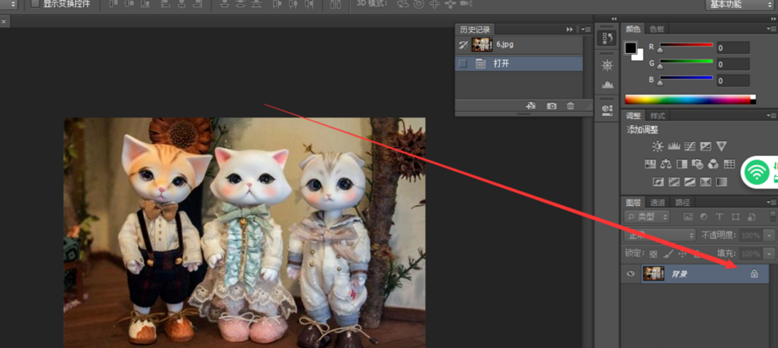 2、点击右边小锁,把这个图层解锁,不然后面操作比较麻烦,