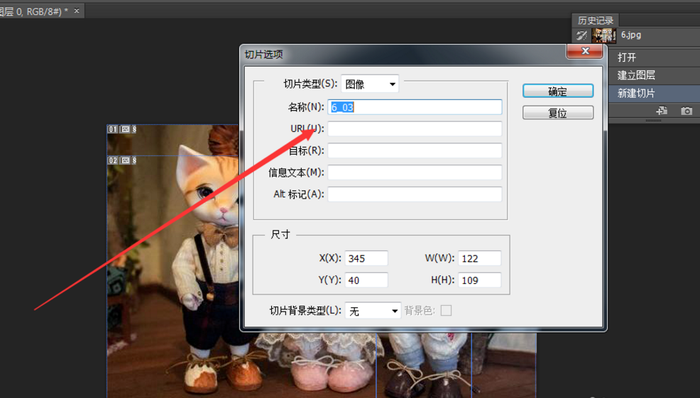 5、切片完成,双击刚刚你切图的位置打开切片的设置。在URL这个位置这里,将需要弹出的窗口链接复制过来保存。