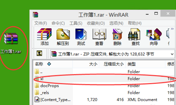 4、双击“工作薄1.rar”,打开的命令框中找到“xl”的文件夹,双击;