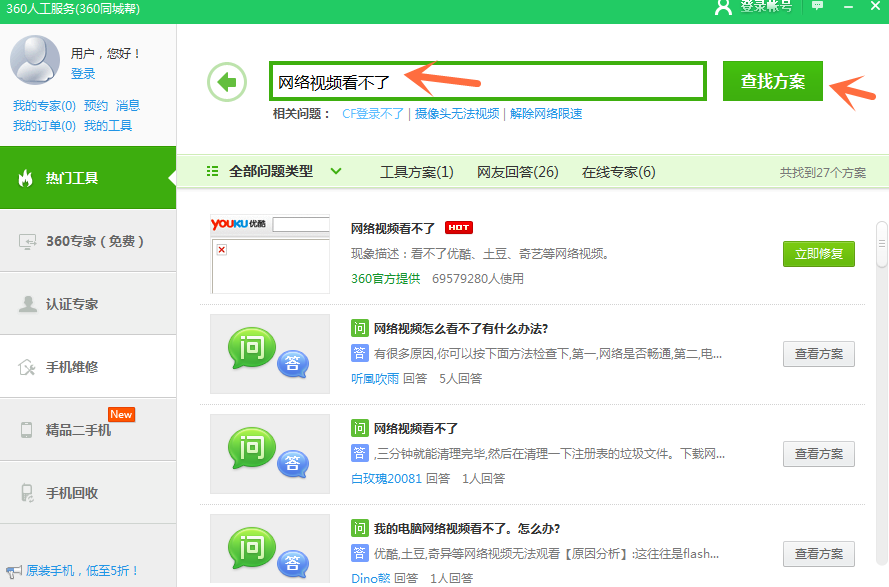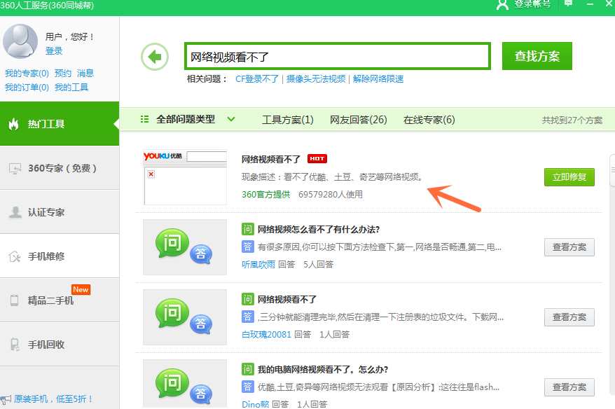 我们在观看爱奇艺、优酷平台上的电影电视时,有时会出现视频看不了的现象,这是什么原因呢?该怎么解决呢?出现这种情况,我们可以试试用360安全卫士中的人工服务来解决,具体过程参见下文。