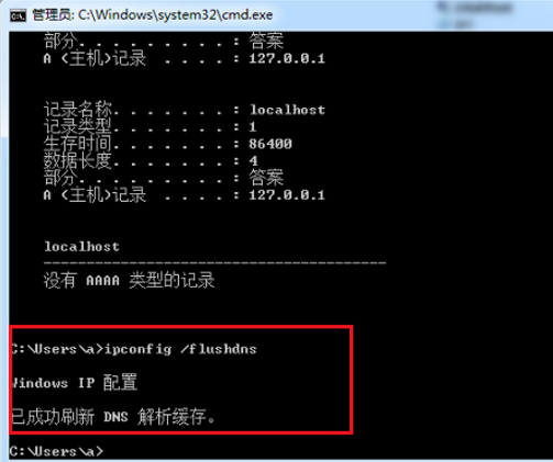 3、我们使用“ipconfig /flushdns”来清除DNS缓存,如下图所示: