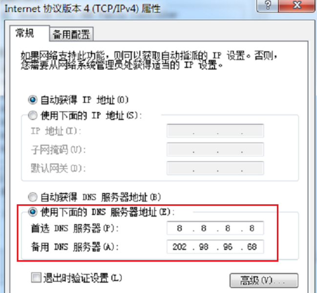 6、进去Internet协议版本4(TCP/IPv4)属性界面之后,将自动获得DNS服务器地址改为使用下面的DNS服务器地址,首选DNS服务器可以设置为“8.8.8.8”也可以设置为本地宽带的DNS地址,如下图所示: