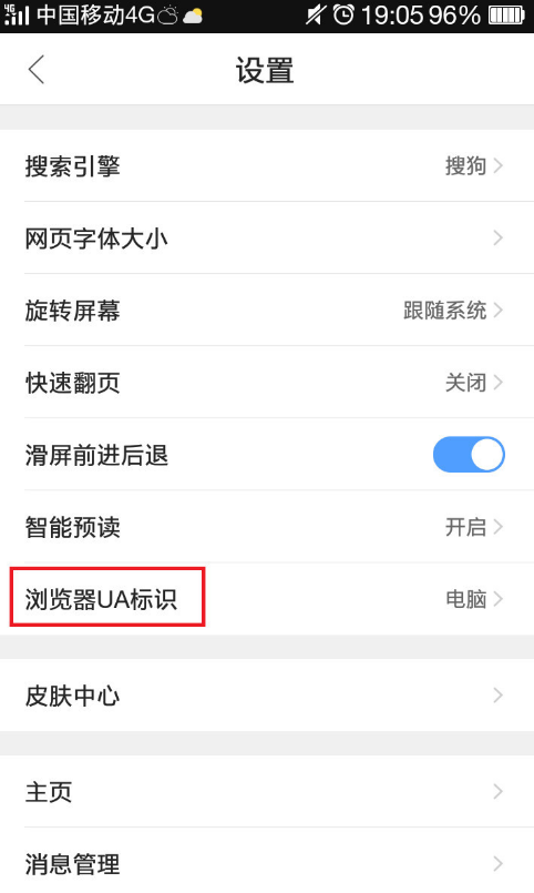 3、在“设置”界面选择“浏览器UA标示”;