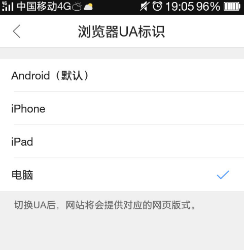 4、在浏览器UA标示界面选择“电脑”选项即可;