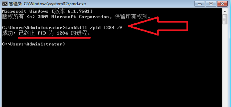 在程序里输入taskkill /pid 1284 /f,回车就会结束相应任务。注意:输入字母的时候一定要有空格!!!!