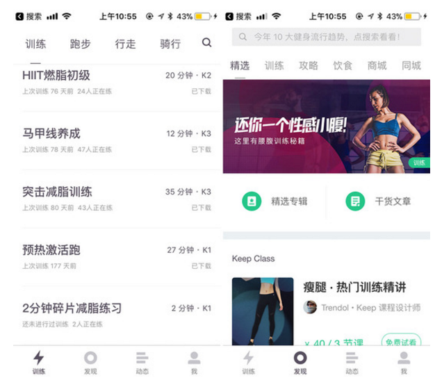 Keep是一款具有社交属性的健身工具类产品。用户可以利用碎片化的时间,随时随地选择适合自己的健身课程进行同步训练。