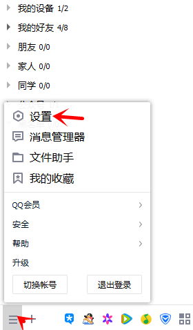 在QQ主页下面选择菜单栏,点击里面的设置。