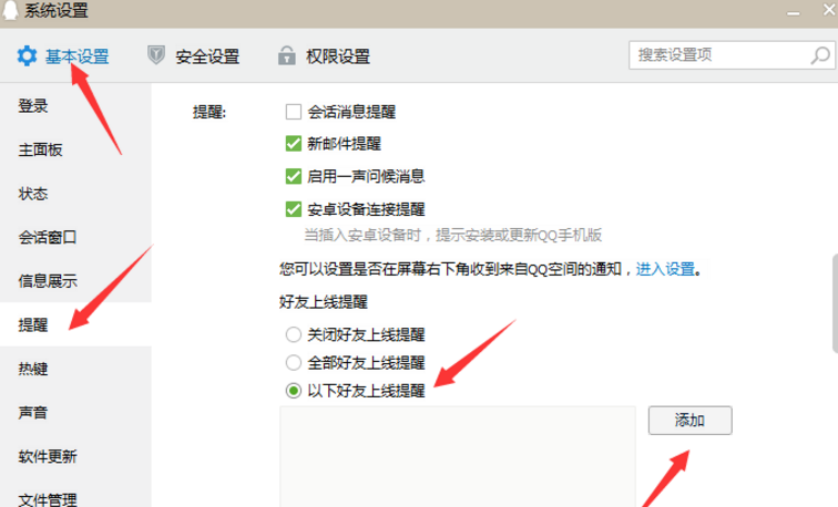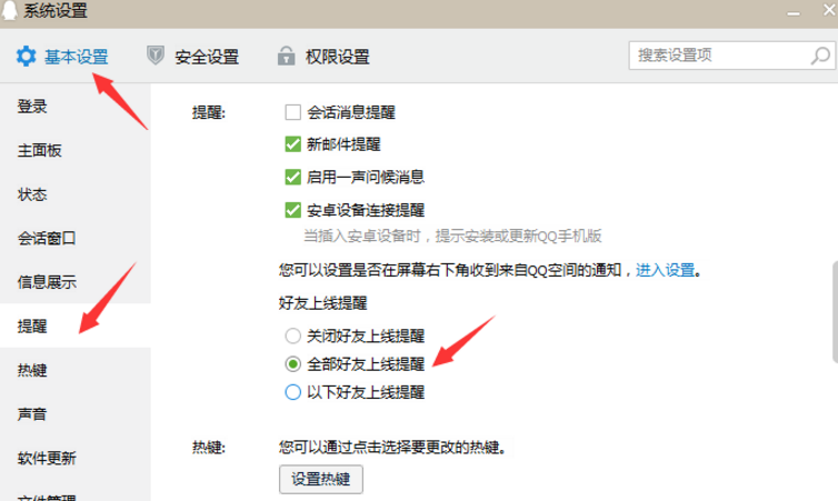 进入系统设置页面,在基本设置里面点击左侧导航栏的提醒,在好友上线提醒下面选择开启全部好友上线提醒,也可以设置部分好友上线提醒。(自己视情况而定)
