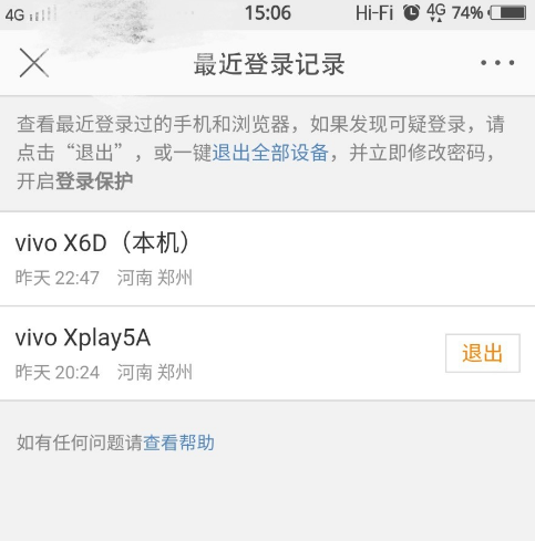 4、我们可以看到最近登陆记录有2条,点击进入最近登陆记录,如果有很多登陆记录,点击上方的退出全部设备;