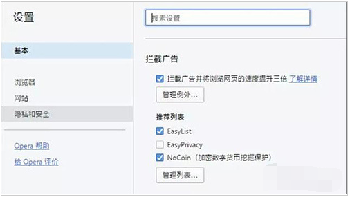 此外另一款知名浏览器Opera也有类似设计,在“设置”→“隐私和安全”中勾选“拦截广告并将浏览网页的速度提升三倍”,然后再从弹出列表中选择“NoCoin(加密数字货币挖掘保护)”即可。