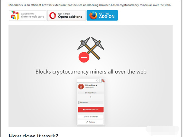 minerBlock的官方网站提供了Chorme、Opera、Firefox三种内核插件的下载。将它安装到浏览器里,就可以自动监测网页中的JS脚本。