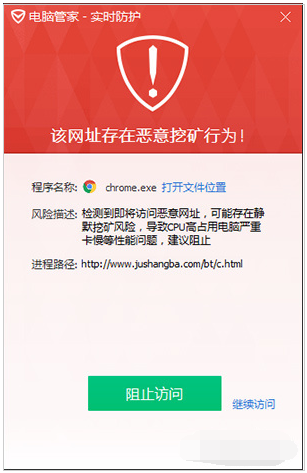 除了通过插件拦截“挖矿”脚本外,一些第三方安全工具也开始集成“反挖矿”功能。比方说最新版QQ电脑管家,就提供了挖矿脚本拦截服务。当程序检测到网页中存在疑似挖矿脚本后,会自动通过弹窗予以拦截,整个操作很像是恶意代码拦截。能够提供更加全面广泛的保护级别。