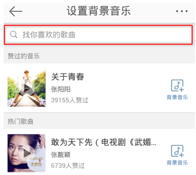 3、进入背景音乐设置页面,此时我们就可以看到页面中的热门歌曲了,您可以在【搜索框】查找喜欢的歌曲,也可以在此页面中直接添加为背景音乐。