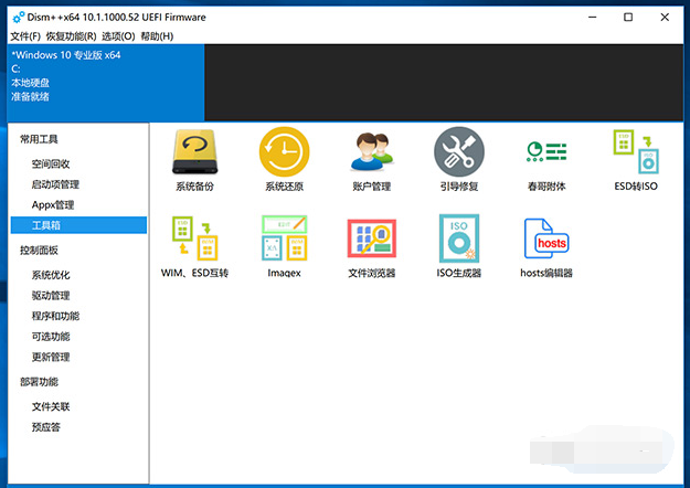 Dism++ 功能丰富强大,同时又小巧实用。集成了系统优化、垃圾清理、启动项管理、软件卸载、文件关联管理、驱动管理、系统更新管理、系统修复维护等许多 Windows 相关功能。也额外提供了诸如系统备份还原、引导修复、ESD镜像转ISO格式、ISO 生成器、系统激活备份、hosts 编辑器、文件浏览器等实用小工具。