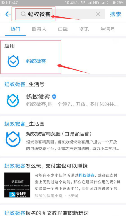 2、然后我们搜索“蚂蚁微客”,会出现多种结果,点击最顶端或者看截图。蚂蚁微客应用,点击打开进入。