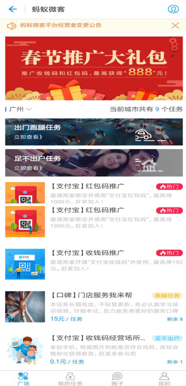 3、定位一下自己的城市,上面有很多人发布任务,当然,你也可以在上面发布任务,让生怀绝技的人来帮你。接下来我们挑选自己合适的任务去完成,完成后从中获利,就这样也可以支付宝赚钱哦!