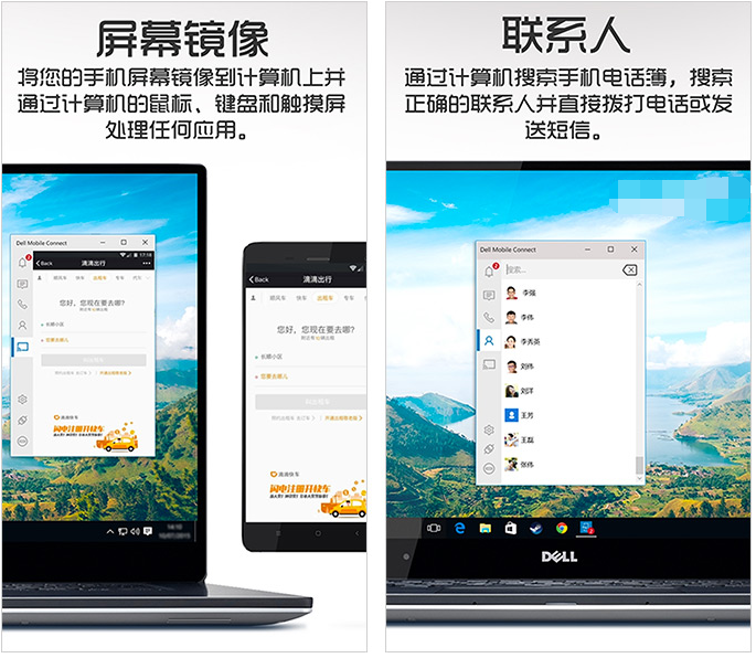 Dell Mobile Connect可以无线连通 iOS、Android 和 Windows 三大平台,它不仅仅只是给你推送个来电或信息的通知,而是实实在在地让电脑手机连通协同工作,从而实现直接在Windows 10电脑上拨打/接听电话、收发短消息、查看联系人 (通讯录),以及显示手机的推送通知。